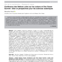 Deux sommets internationaux consacrés à l’océan se sont tenus en janvier 2022 puis en juin 2022 : One Ocean Summit à Brest (France) puis la Conférence des Nations unies sur les océans à Lisbonne (Portugal). Au-delà de l’importance de connaissances scientifiquement établies comme socle pour guider les politiques environnementales et la protection de l’océan, ces deux conférences mettent en évidence de grands enjeux scientifiques et de fortes attentes envers la recherche que l’on peut regrouper en six thématiques : changements climatiques et océan, alimentation – c’est-à-dire ressources halieutiques et aquaculture –, grands fonds océaniques, pollutions, océan polaire, aires marines protégées, océan numérique, ADN environnemental. Ces deux conférences ont lancé ou mis en avant les grandes initiatives internationales, européennes et nationales qui seront structurantes pour les sciences océaniques, notamment la Décennie des Nations unies pour les sciences océaniques au service du développement durable (2021-2030) et au niveau européen la mission « Restore our ocean and waters ». La coopération internationale autour de grandes infrastructures de recherche s’est renforcée comme en témoignent la transformation de Mercator Ocean International en une organisation intergouvernementale ainsi que les initiatives partagées des opérateurs de flottes océanographiques européennes. Globalement, il faut donc souligner le bilan positif pour les sciences océaniques. La recherche s’est organisée et les deux sommets confirment que des moyens y seront consacrés. Le prochain grand rendez-vous sera la conférence des